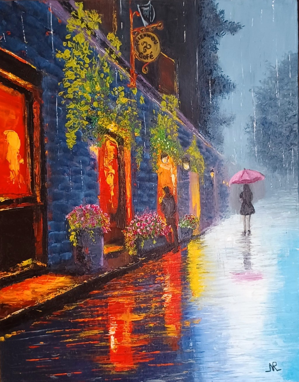 Huile sur toile 46 X 55 Ce sont les visages de mes arrières-grands-parents, Henri et Juliette qui étaient dijonnais. D’après une libre interprétation d’un tableau de Gustave Caillebotte « Rue de Paris, temps de pluie » 1877.Art institute of Chicago.Il s’agit de…
