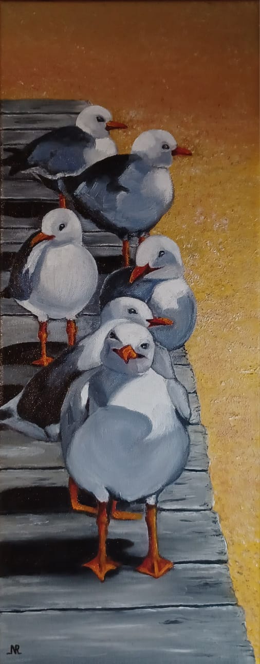 Huile sur toile50 x 20 Moi, la mer et les mouettes.Temps clair.Depuis le ponton, les mouettes m’observent.Paisibles et attentives, elles me regardent sans peur.Leur position de bonnes auditrices me va droit au cœur.Doucement je me mets à chanter.
